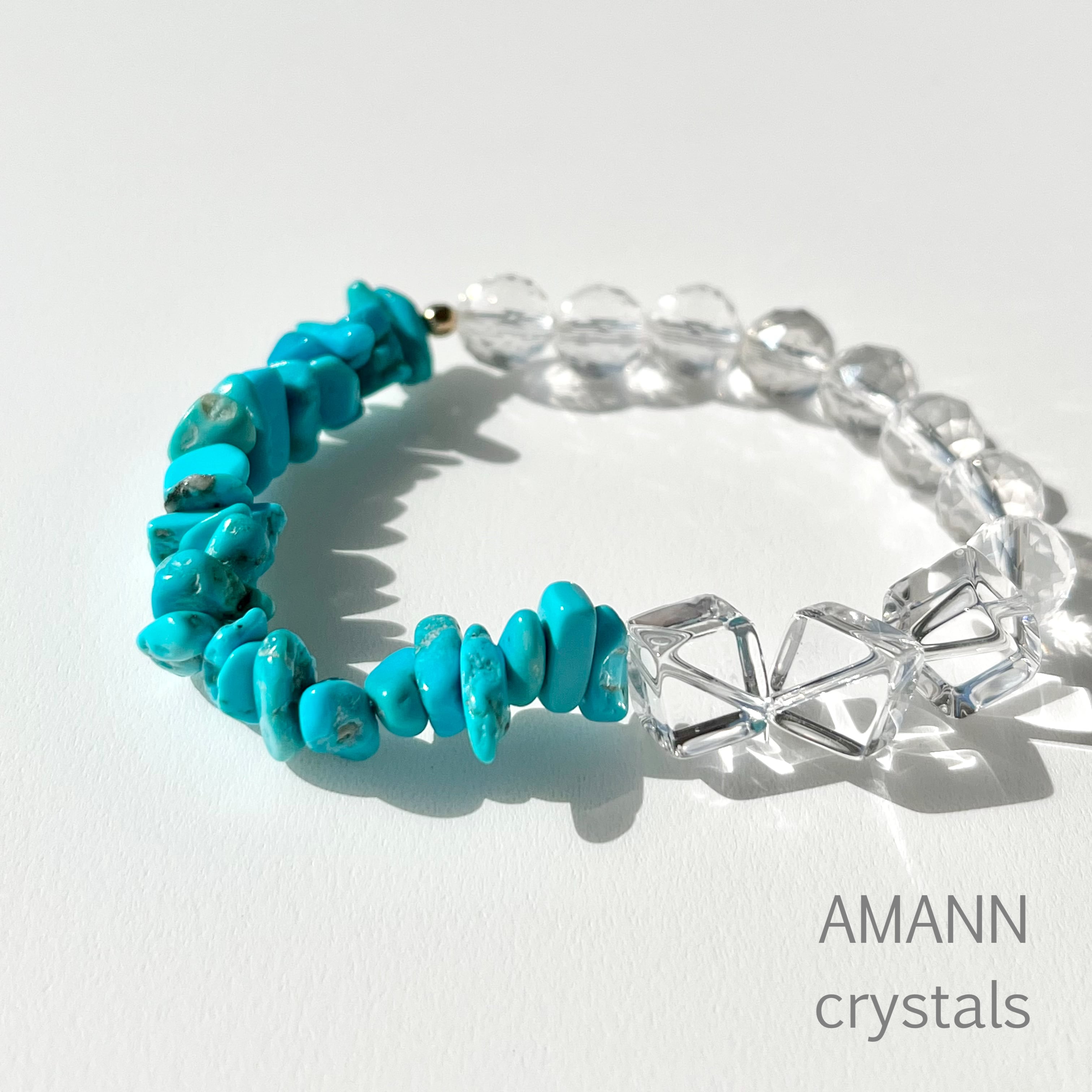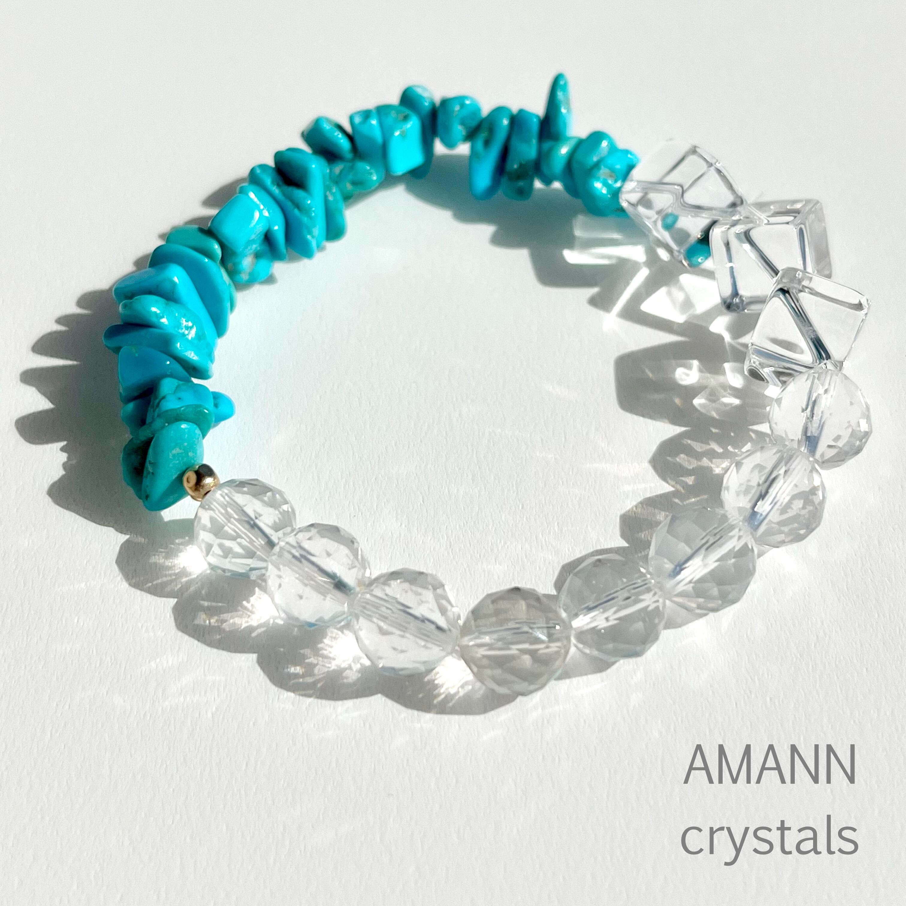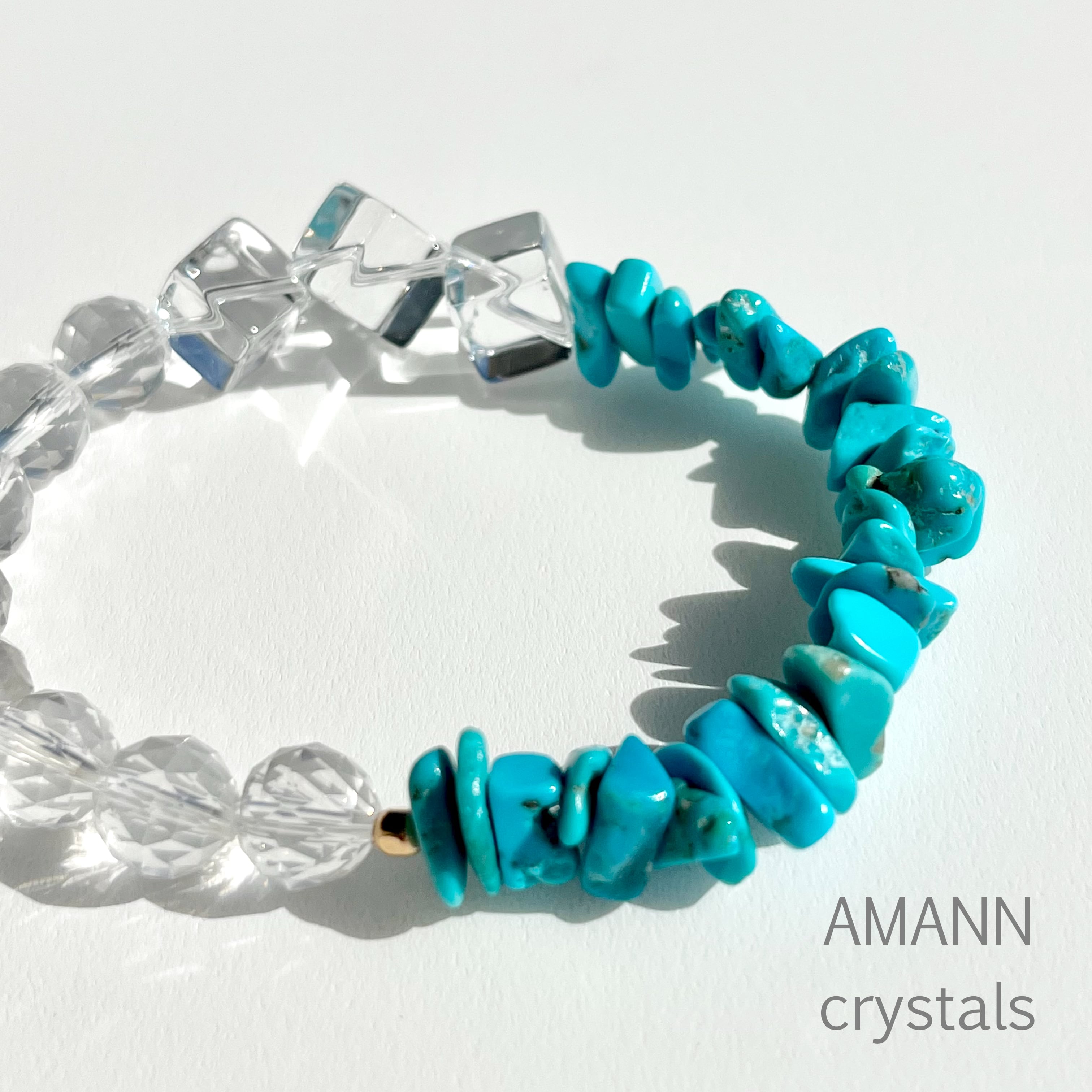 ミルキークォーツと水晶の癒しのエネルギーとターコイズの守りのエネルギーが調和したブレスレットです。