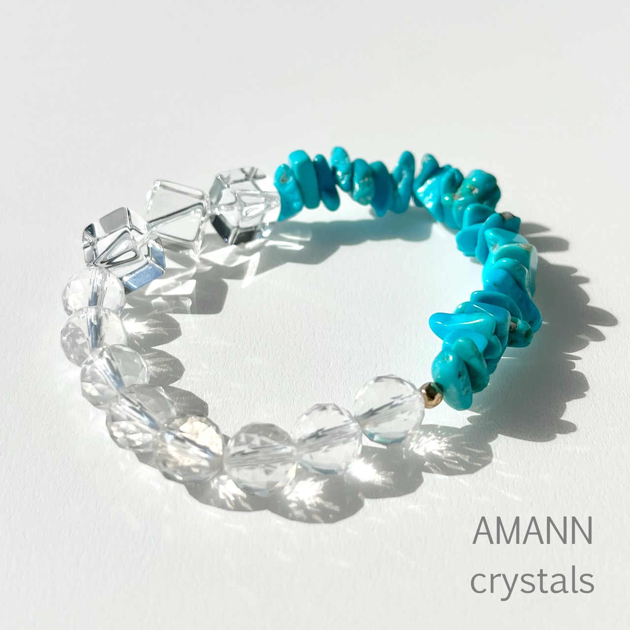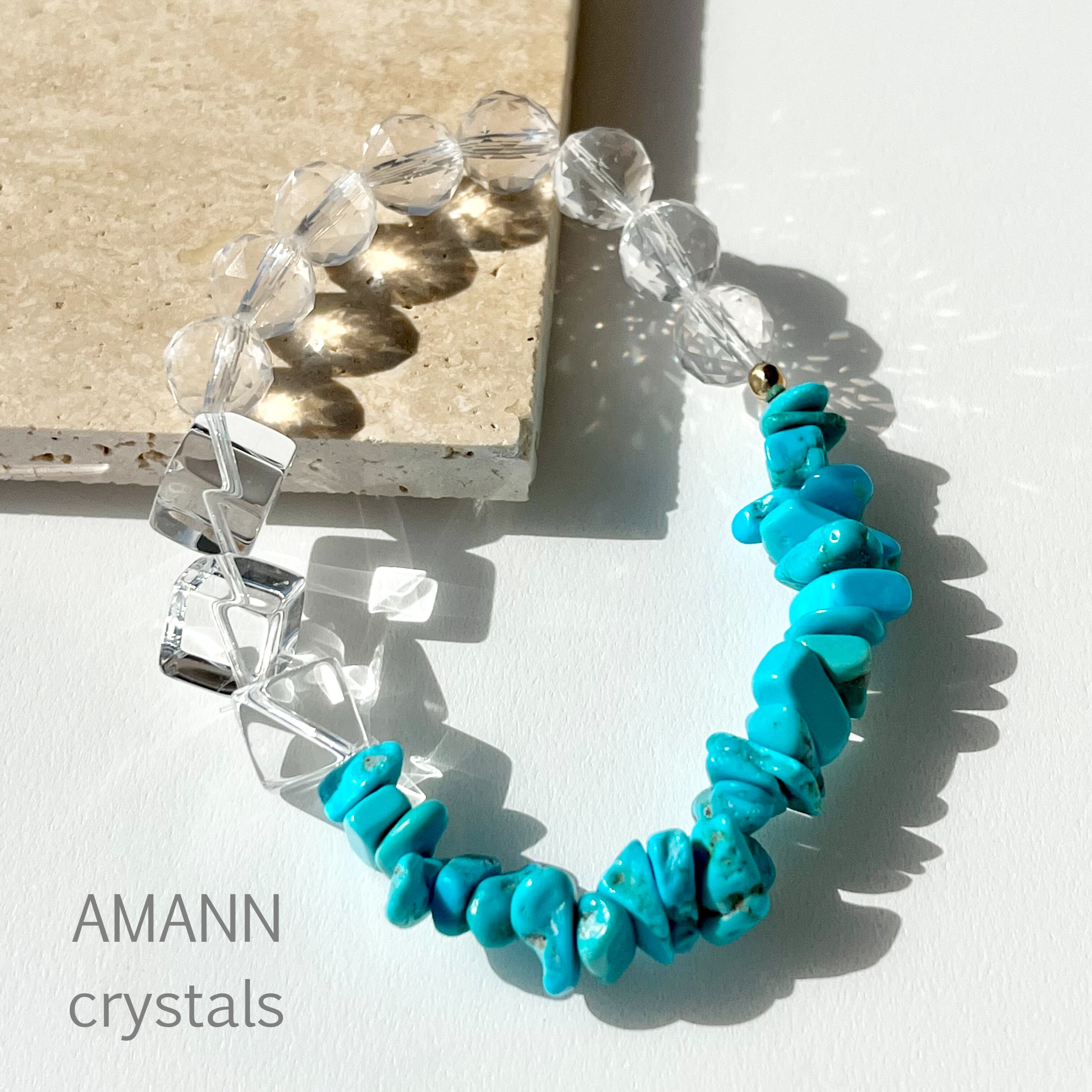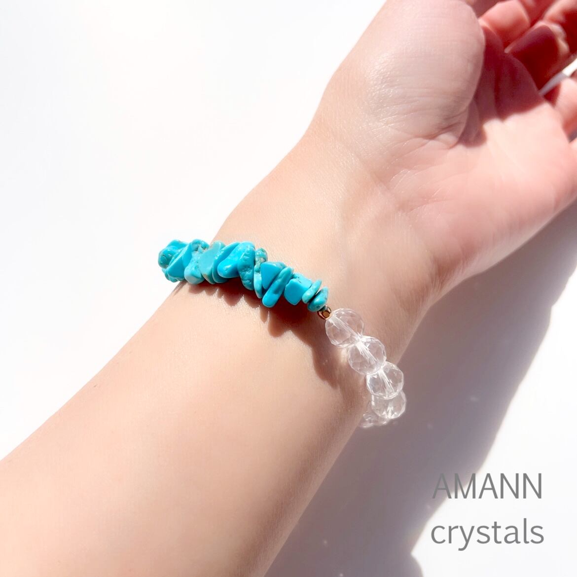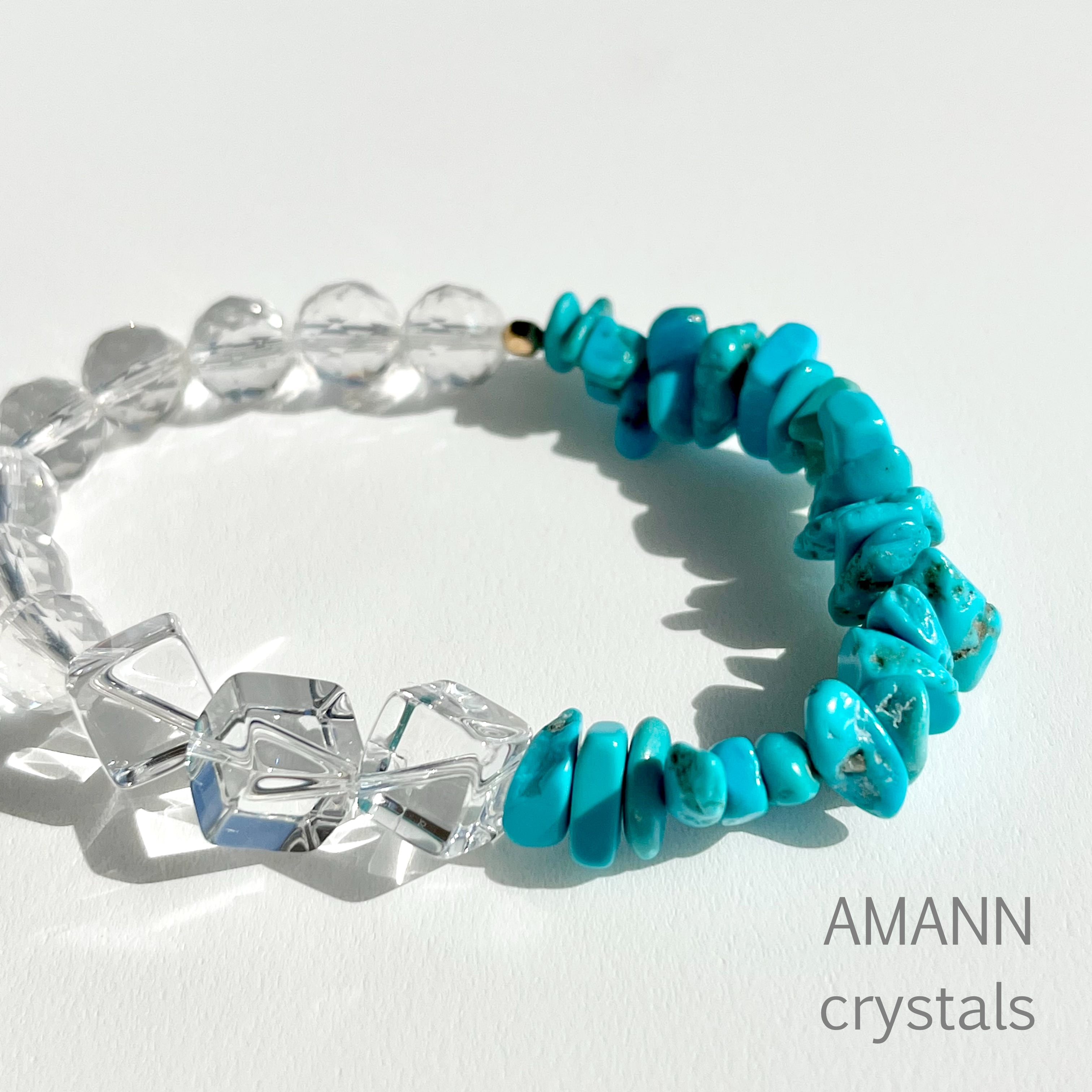 ミルキークォーツと水晶の癒しのエネルギーとターコイズの守りのエネルギーが調和したブレスレットです。