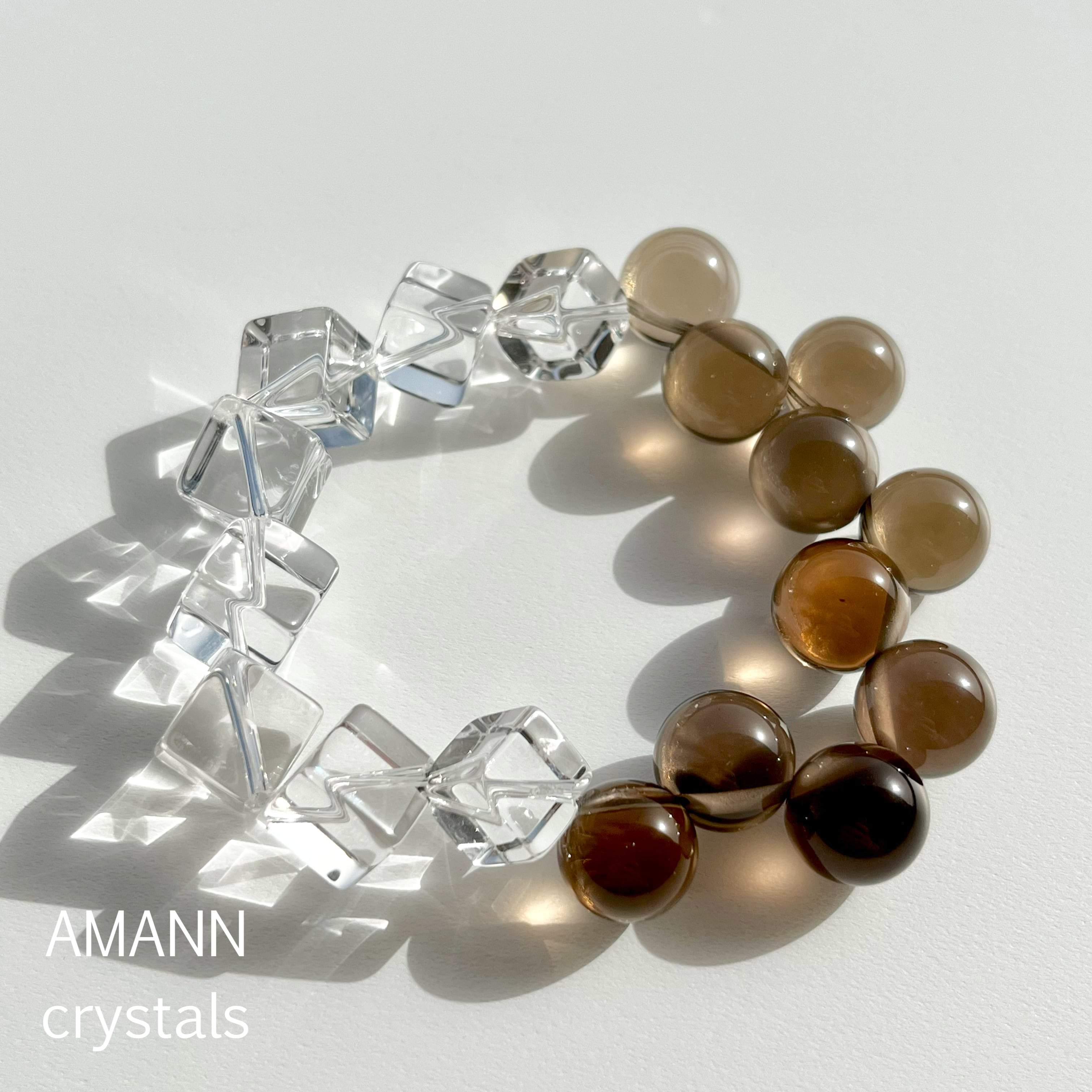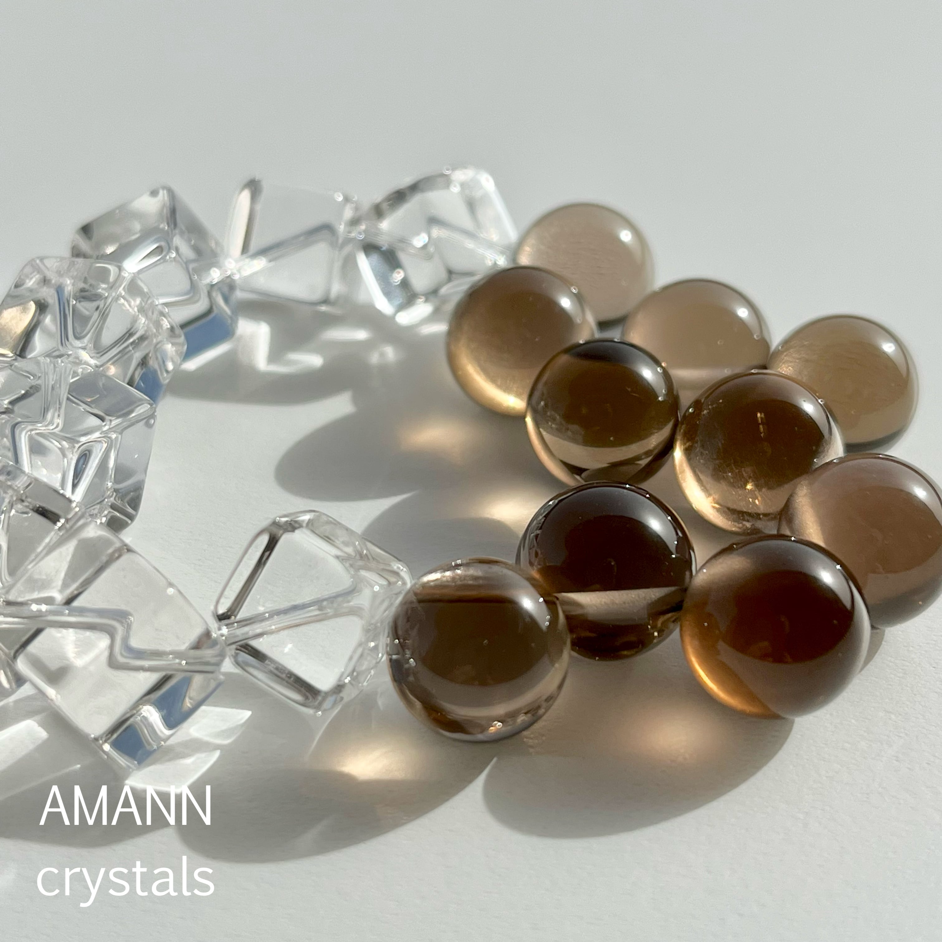 スモーキークォーツは透明度が高く、端に穴が開いているため、水晶玉を覗き込んでいるような不思議な感覚がします。コロコロとした、ランダムな動きのあるスモーキークォーツと氷のように透明度の高い水晶で、遊び心のあるデザインにしました。